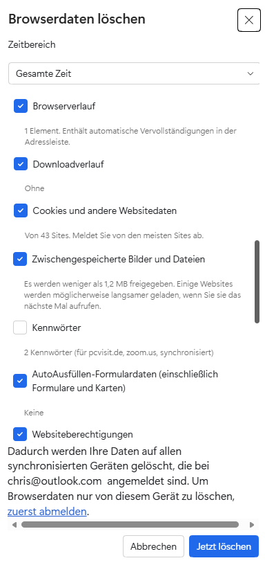 In diesem Fall empfiehlt sich das Löschen dieses Puffers, dem Browser-Cache. Allerdings gibt es zu beachten, dass je nach den eigenen Bedürfnissen bestimmte Optionen zuvor deaktiviert werden, wie im folgenden Beispiel die Kennwörter. Sind diese nicht an einem sicheren Ort als Kopie vorhanden, gehen sie verloren.